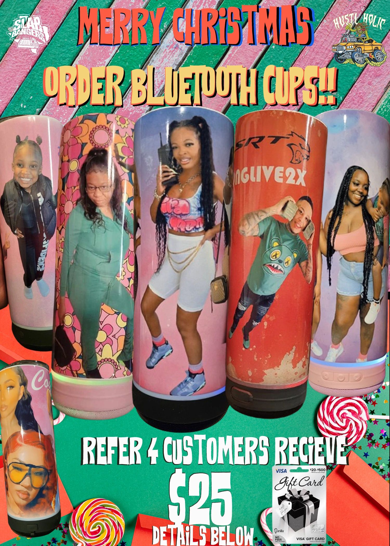 To recieve $25 (visa or cashapp) customer must have referred 4 customers to Pre order minimum of 2 bluetooth cups for $79.99 with a deposit of $20 Once 4 Customer has paid their $20 deposit pre order. Slabbangers LLC will pay out $25 to Customer that referred them (1 Business day). Customer that referred new customers can recieve $25 per 4 customers unlimited that they refer to us for Christmas pre orders with a $20 deposit. Customer must fill out form with the 4 names and phone # of Customers that they have referred & the Customers that were referred must put the name of the Customer that referred them to be eligible for the $25 Cashapp or visa gift card. So for example if Customer refers 8 new customers to pre order for Christmas customer that referred can recieve $50 just fill out the form twice because referral form only holds 4 referrals at a time who they referred Please click the button below to upload your 4 Christmas Pre orders.