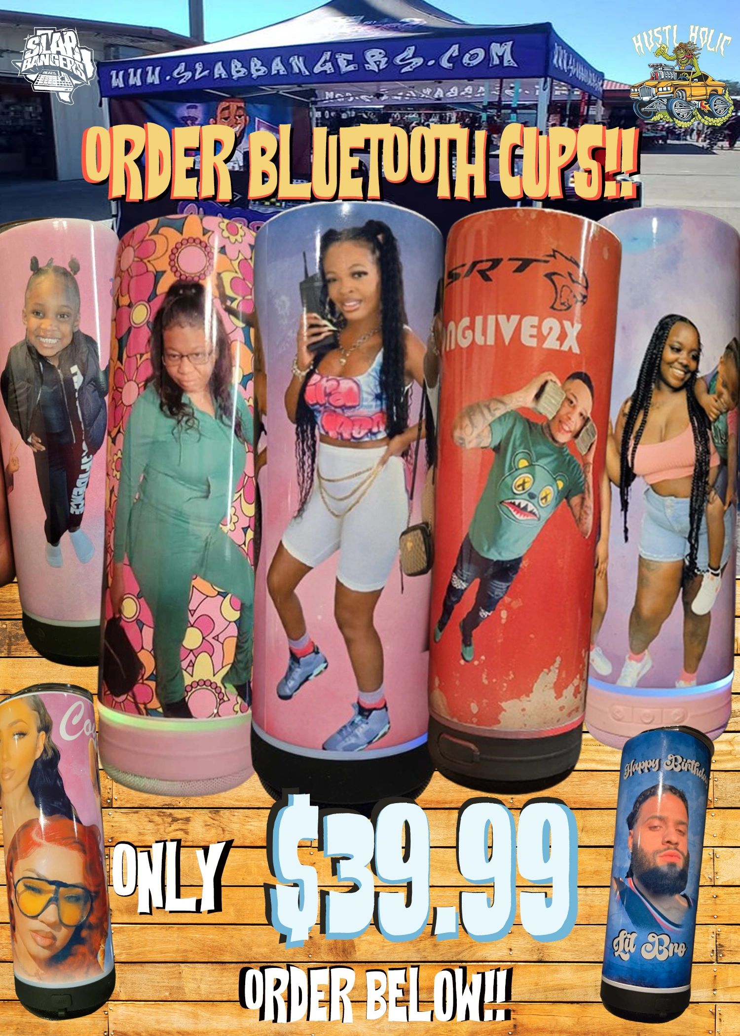 Complete the Bluetooth Order form below, adding all your favorite pictures and details you want your cup to resemble. Please submit the form and pay (using After Pay Buy Now Pay Later), click the AfterPay button bottom of page for the AfterPay. Contact Nick@slabbangers.com questions. Serious inquiries!